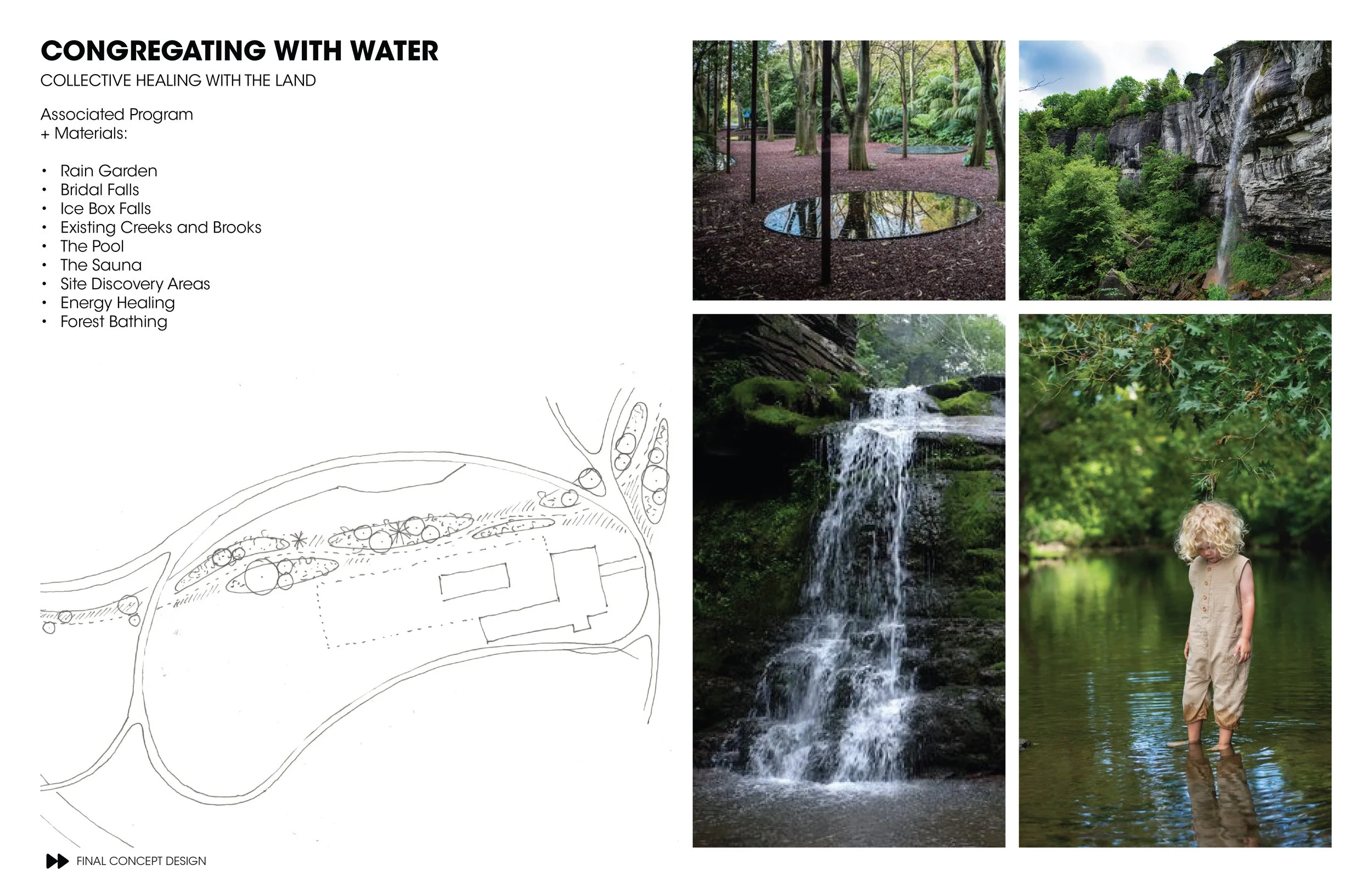 The third principle, congregation with water, features the site’s natural hydrologic systems and the opportunity to interact and heal with the elements. Recreation, ritual, and reflection are several ways visitors can convene with water. The presence of ecologically significant stream corridors and wetlands requires space and respect but also offers unique experiences to hikers, campers, and any visitor looking to spend time with the dynamic and native landscapes of the Catskills. Areas of the property susceptible to flooding and inundation during storm events present opportunities for rainwater gardens as a site feature. The development of the property that shares the revelatory history of the Catskills and Hudson Valley region will ensure the landscape remains a popular destination for locals and tourists for years to come.