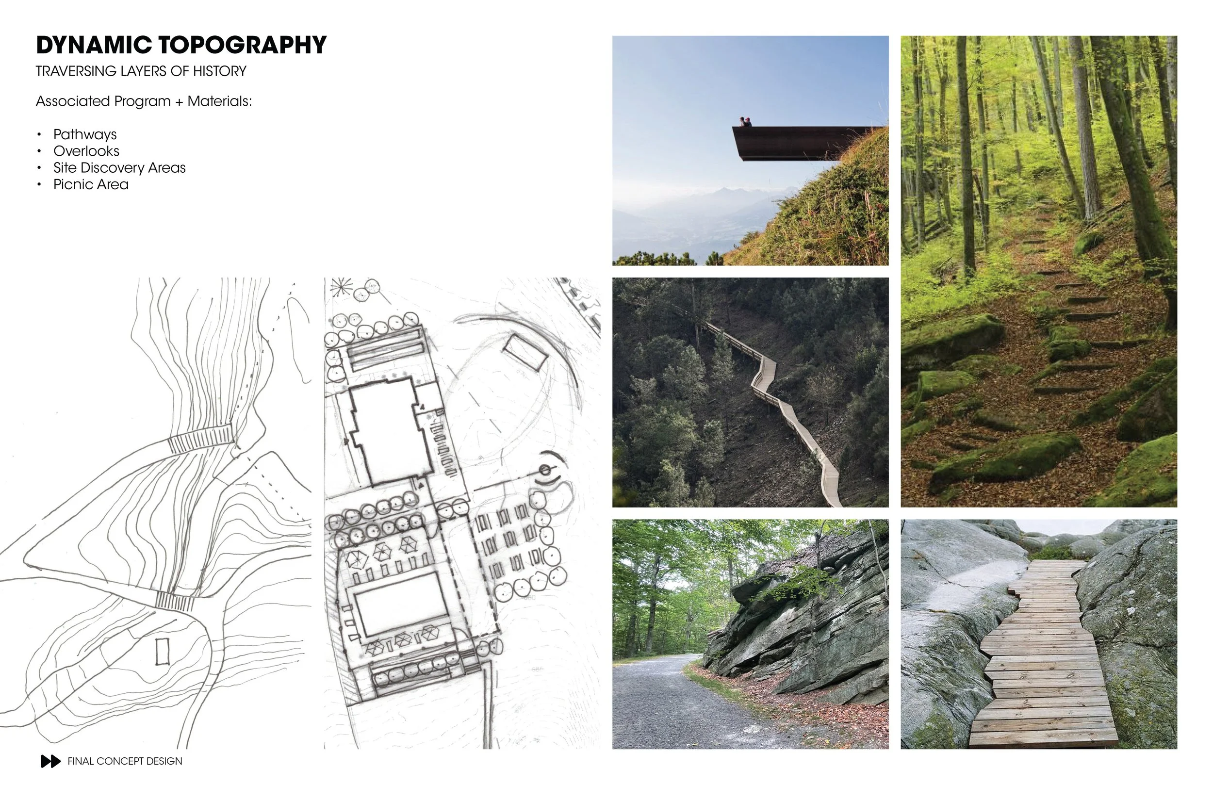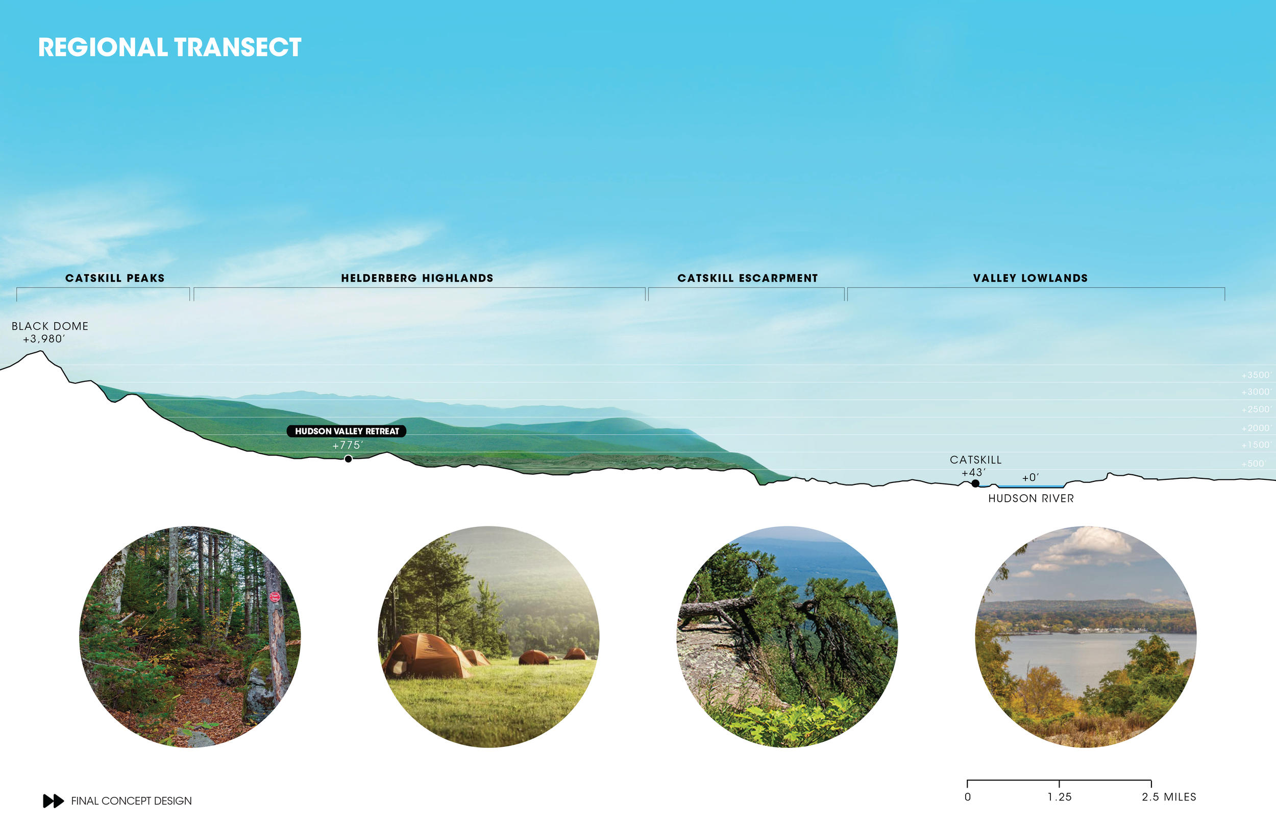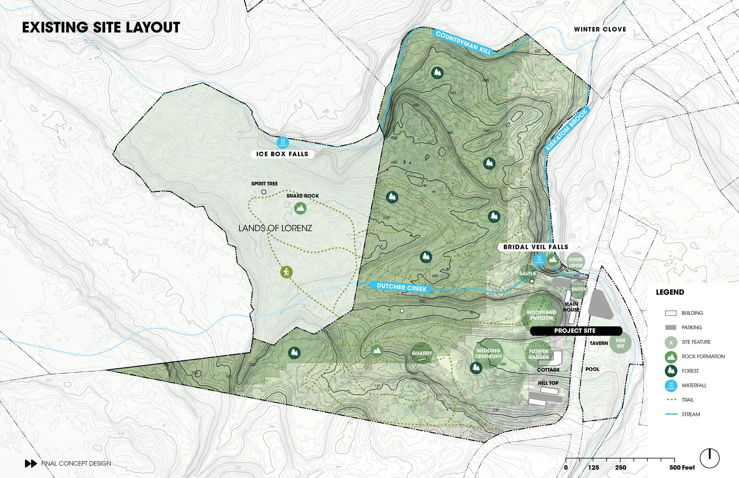 The Hudson Valley, layered with history, reveal a complex past from the geologic record, told through the dynamic topography to the cultural remnants of mountaintop hotels and legendary music festivals. The Hudson Valley Retreat Space sits at the gateway to the Catskill Mountains, telling its layered history. The Retreat Space has had many past lives, but now is an outdoor event space, spa, hotel, and network of trails. The proposed comprehensive plan provides a framework for how to feature the land’s most spectacular elements.