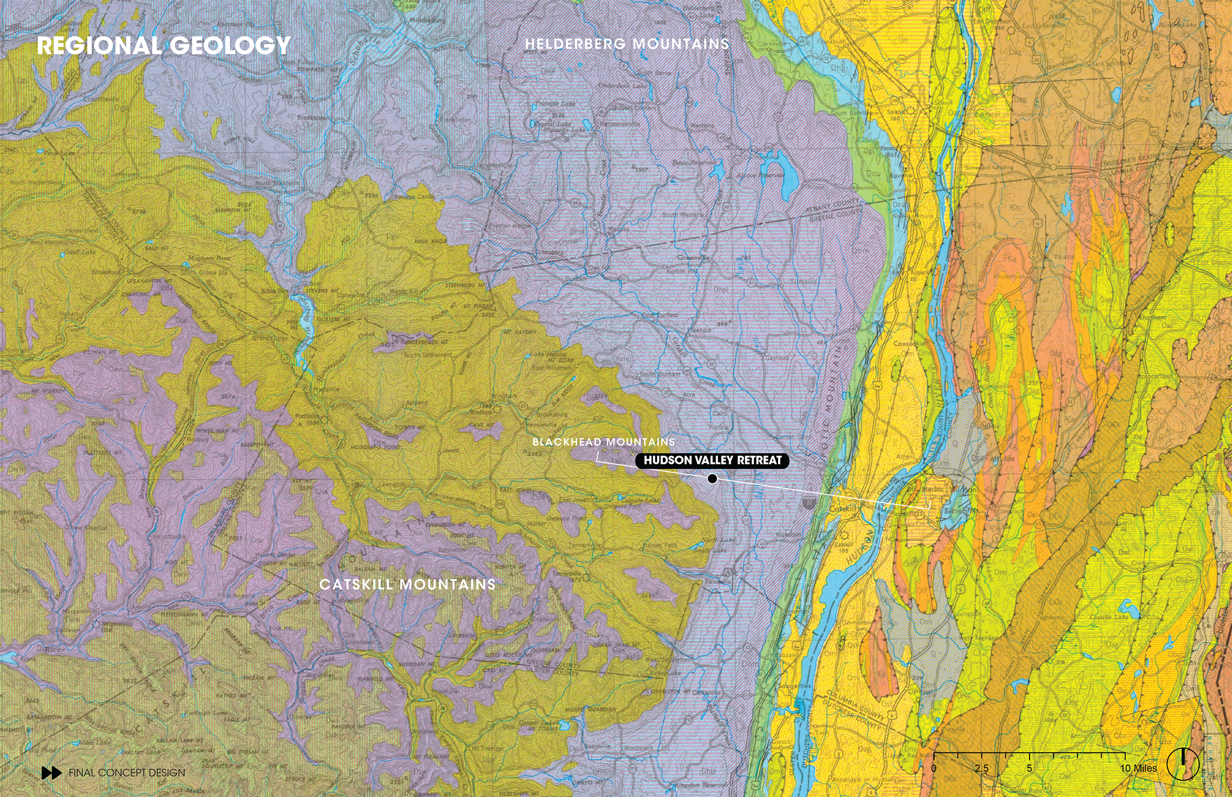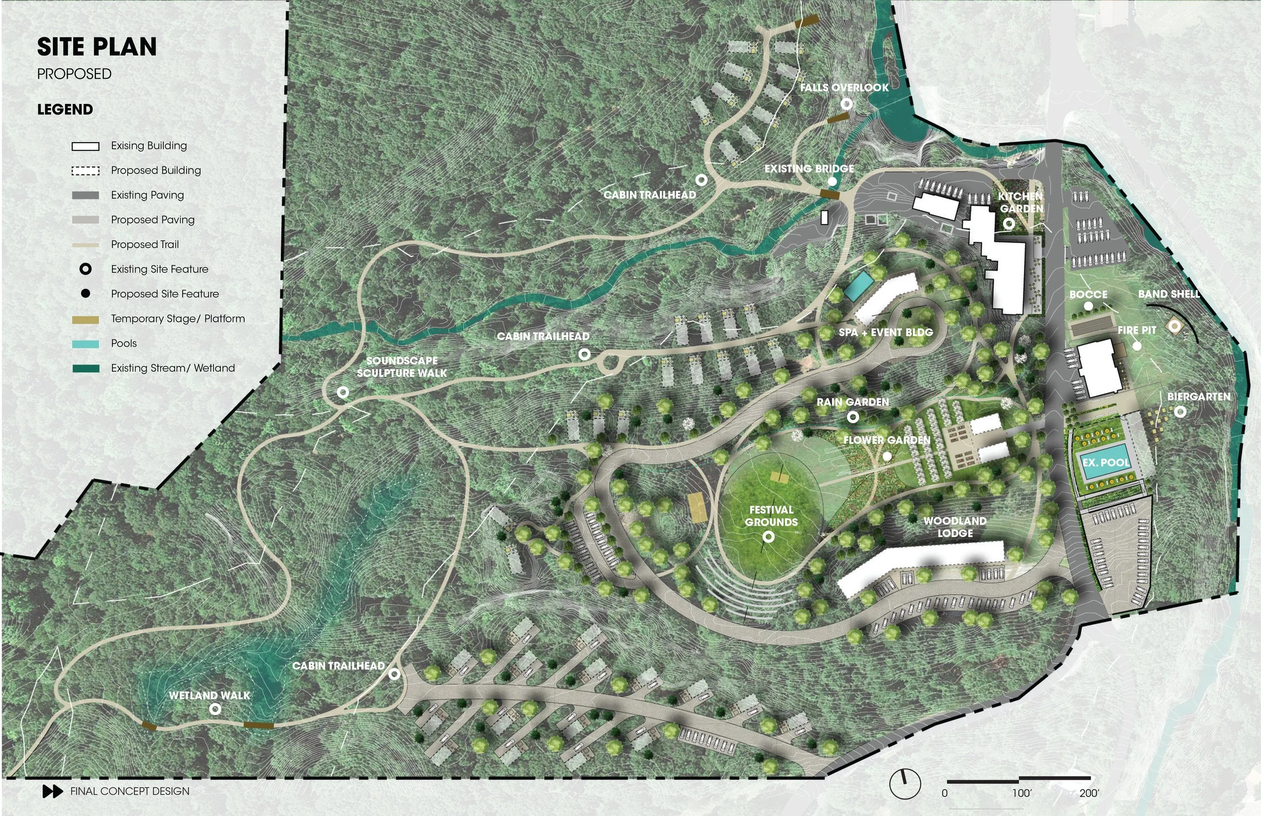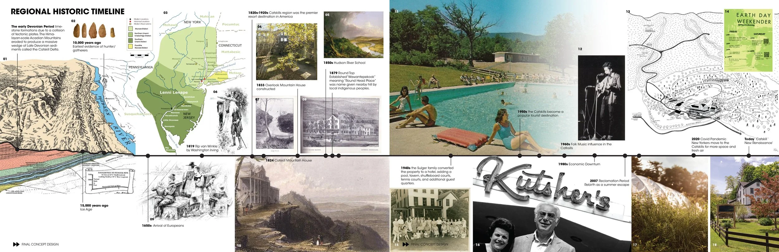 The Hudson Valley, layered with history, reveal a complex past from the geologic record, told through the dynamic topography to the cultural remnants of mountaintop hotels and legendary music festivals. The Hudson Valley Retreat Space sits at the gateway to the Catskill Mountains, telling its layered history. The Retreat Space has had many past lives, but now is an outdoor event space, spa, hotel, and network of trails. The proposed comprehensive plan provides a framework for how to feature the land’s most spectacular elements.