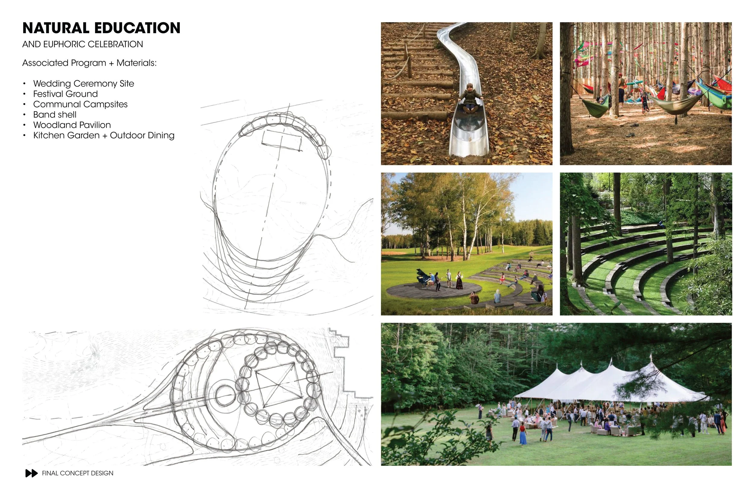 The second principle of euphoric celebration draws from the region’s ties to music and the joy of experiencing nature. The Catskills became a known vacation destination in the 1800s with the construction of remote hotels with expansive views of the Hudson Valley. It exploded in popularity in the 1950s with the Borsht Belt resorts catering to the Jewish Community. The culture of euphoric celebration blossomed in the Catskills after hosting the most famous music event in history, Woodstock, in the summer of 1969. The site taps into that legacy by featuring several event spaces, varying in scale and character to adapt to the types of celebrations on site, ranging from intimate weddings to weekend-long music festivals. In addition to collective gathering, It was essential to the owners also to provide space for individual celebration and reflection.